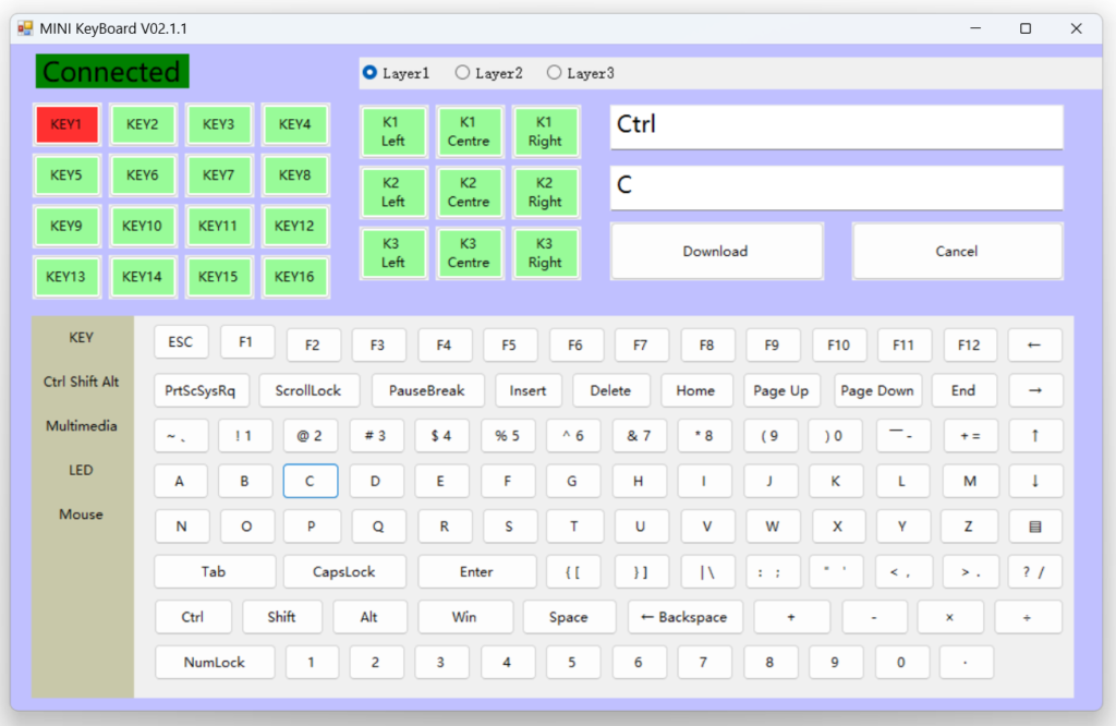 このため、例えばKEY1にコピー機能(Ctr+C)を登録するには、KEY1→Ctr→C→Downloadの順に入力します。