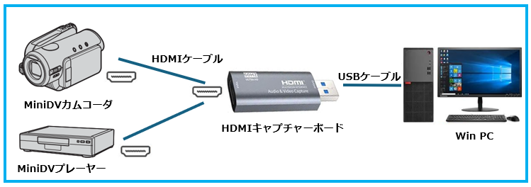 必要なのは、①MiniDV用の再生機、②HDMIケーブル、③HDMIキャプチャーボード、④USBケーブル、それに⑤WindowsのPCの5点です。