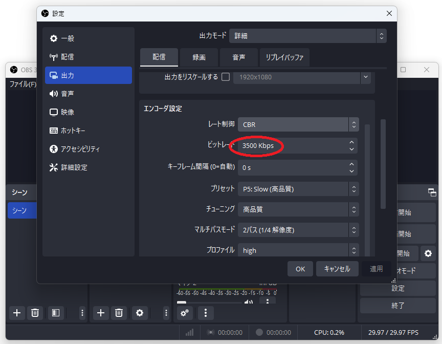 更に下方向にスクロールして、ビットレートは余裕を持たせて3500kbpsとしておきます。