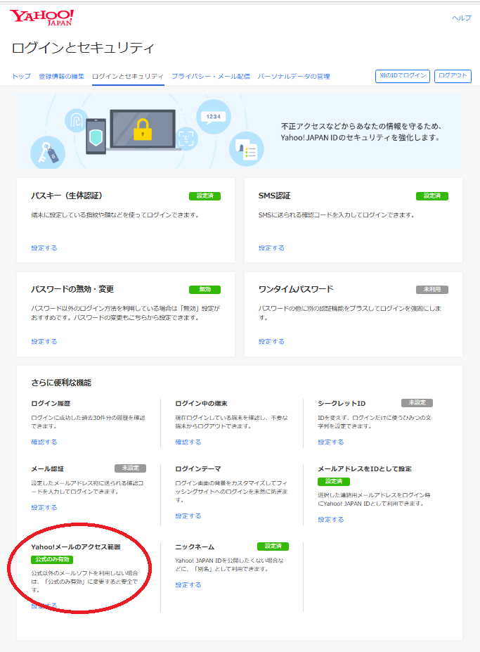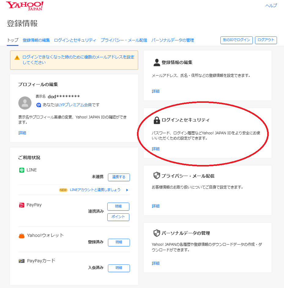 色々試行錯誤を重ねた結果、やっと見つけたのが下にありますYahoo! JapanのHPにあるログインとセキュリティの画面です。