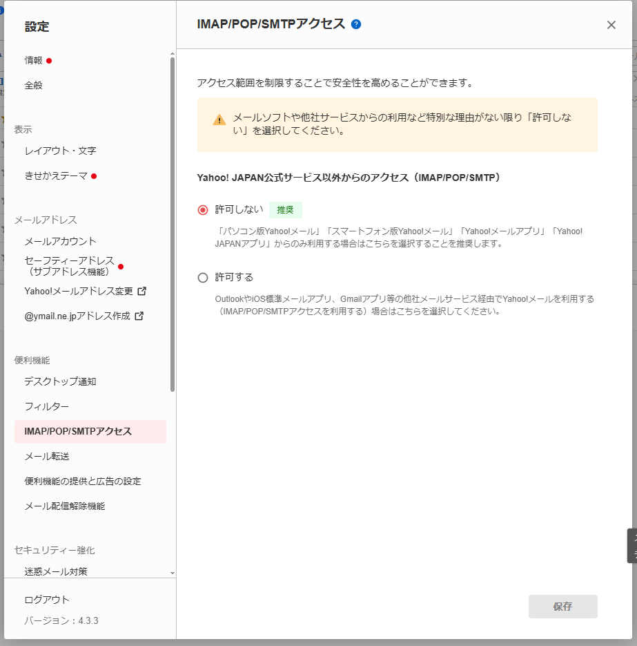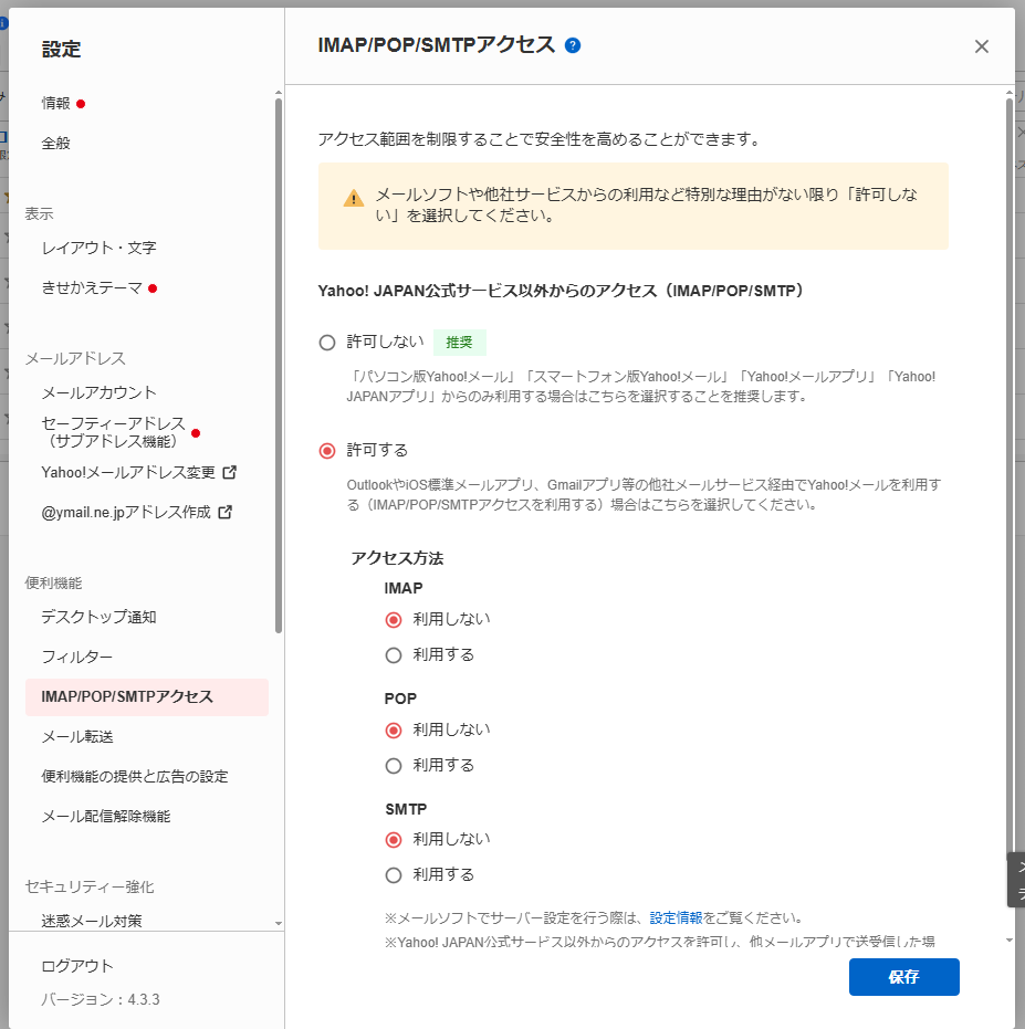 どうやらデフォルトではYahoo Japanのメールサービス以外からは、このメールサーバーへはアクセスできない様になっている様です。